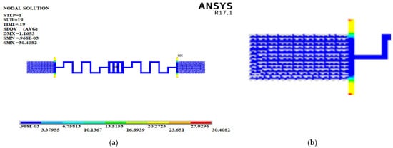 When actuation voltage is supplied in the actuator portion, stress is produced on the structure, which is called von Mises stress. Von Mises stress was observed in ANSYS APDL and is shown in Figure 7. Maximum stress is shown on the torsion spring’s end. The torsion spring’s end pressure is 30.4 MPa, which guarantees that the structure can sustain the applied voltage without collapsing because it is less than the aluminum’s yield strength.