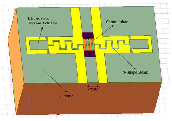 The proposed design is composed of two segments: the actuator part and the capacitor part. The electrostatic actuator is joined to the capacitor part by introducing the s-shaped beam. This is the first demonstration of an s-shaped beam to be utilized to connect the actuator part and capacitor part. The planned RF-MEMS variable capacitor is shown in Figure 2a.