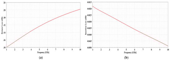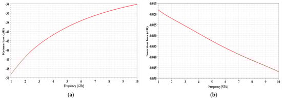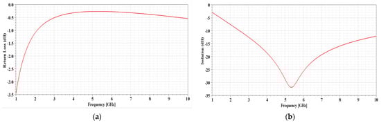 When there is no gap between the plates in the capacitor part, scattering parameters show the off-state properties of the structure. Maximum isolation and 0 dB return loss are the optimal conditions for the OFF state [1]. The scattering parameters in the OFF state for the 1–10 GHz frequency range are shown in Figure 9a,b. At 5.3 GHz, Figure 9b depicts the peak isolation of −31.81 dB. At this frequency, the return loss in the OFF state is −0.26 dB. Thus, at 5.3 GHz, the device yields the best results.