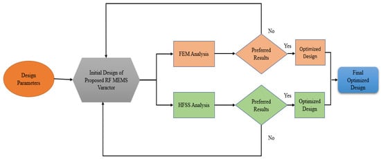 Microelectromechanical systems (MEMS) variable capacitors using parallel plates are becoming increasingly popular in radio frequency (RF) applications due to their high-quality factor, fast response time, and straightforward design. Reconfigurable RF front-end modules can be made easy by microelectromechanical system (MEMS) changeable capacitors, which can help them fulfill space limitations by requiring fewer components and meeting the requirements of modern multi-band applications. Moreover, MEMS components have reduced power consumption, greater quality factor, and lower insertion loss when compared to solid-state equivalents such as Schottky varactors and p-n junction diodes [1]. Applications for reconfiguring MEMS variable capacitors include tunable impedance matching or antenna frequency tuning to maximize antenna efficiency in various environments and reconfigurable filters to increase performance selectivity while requiring fewer components overall [2]. RF filters [3,4], phase-locked loop circuits (PLLs) [5], voltage-controlled oscillators (VCOs) [6], and other applications are based on MEMS varactors.