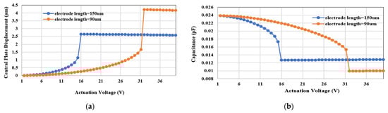 Comparison of (a) central plate displacement at different electrode lengths and (b) up-capacitance at different electrode lengths.