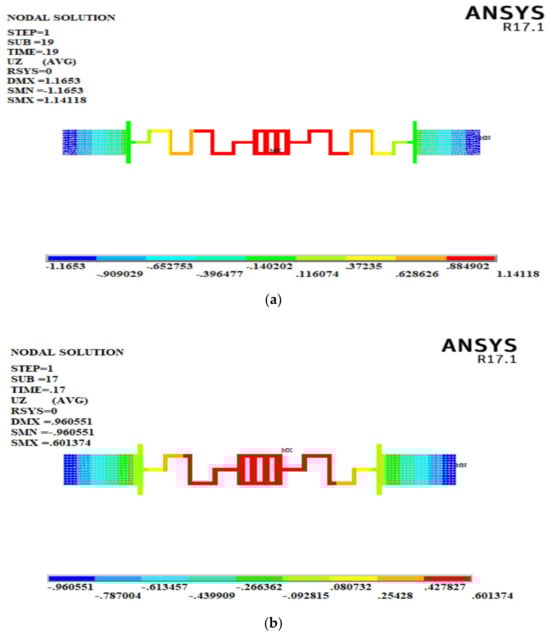Parametric analysis is done to get the optimized s-shaped beam length. Figure 14a,b shows the ANSYS results for 290 um and 190 um s-shaped beam lengths. The capacitor plate displacement of the MEMS variable capacitor with 290 um is 1.14 um; however, for the MEMS varactor with 190 um, it is 0.60 um. Maximum displacement is achieved for 290 um s-shape beam length at 15.2 volts. An optimized s-shape beam is obtained in terms of central plate displacement, up-capacitance, and tuning ratio.