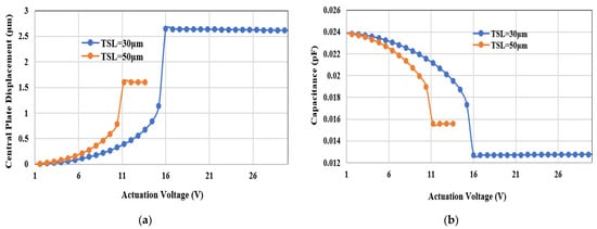Comparison of (a) central plate displacement at different torsion spring lengths and (b) up-capacitance at different torsion spring lengths.