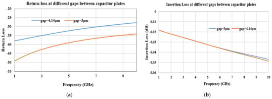 There is a predictable effect on the scattering parameters by varying the gap between the plates within a specific range of frequency (1 GHz to 10 GHz). A parametric analysis of the proposed design is performed to optimize the space between the plates in the capacitor section. From the graph in Figure 16, it is shown that by increasing the gap between the plates, return losses are increased. While there is no difference in insertion loss from varying the gap.