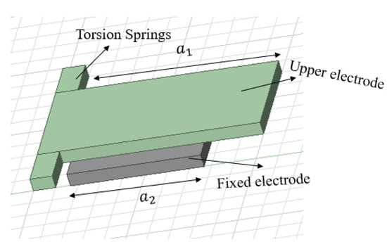 The length of the upper electrode and bottom plate is and , respectively, while w is the width of the electrode. A cross-sectional view of the electrostatic torsion actuator is shown in Figure 2b. For the planar mode of the electrostatic actuator, the length of the upper electrode is equal to the bottom plate; however, for the non-planar type of electrostatic actuator, unequal lengths of the top electrode and bottom plate are presented.