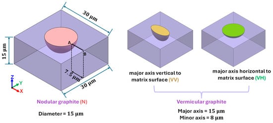 For comparability, specific dimensions of the particles were used in this study: the diameter of a nodular graphite particle (Nod_N)—15 μm—was equal to the length of the major axis of vermicular graphite inclusions. The volume of nodular graphite was 6.5%, within the typical volume fraction range for CGI [30]. Vermicular graphite was assumed as an oblate spheroid with a minor axis length of 8 μm and oriented in different directions with regard to main axes related to the cubic matrix. The model with the major axis of vermicular particle oriented perpendicular to the top surface of the cubic matrix is denoted as Ver_VV, while that with the major axis aligned parallel to the top surface of the metallic matrix (i.e., parallel to the XY plane, Figure 2) is referred to as Ver_VH. The effect of interaction between graphite inclusions was not considered in this study. This approach enables the evaluation of the impact of both matrix phases on graphite debonding. To account for the remaining graphite inclusions, the metallic matrix was modelled with effective properties of the metallic (ferrite or pearlite) matrix.