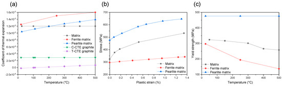 Thermomechanical parameters of different model domains: (a) CTEs of selected matrices and graphite inclusions; (b) plastic behaviours of selected matrices at room temperature; (c) yield strength of matrix constituents under different temperatures [19,38,39].