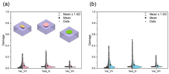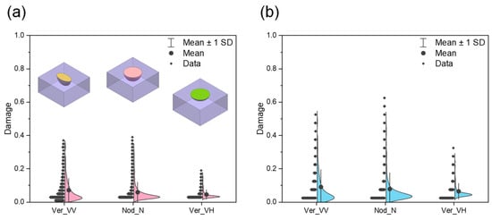 In this part of the study, C-CTE was assigned to graphite inclusions, whereas three types of the metallic matrix were considered, as discussed above—common (effective), pearlite and ferrite. The distribution of damage in graphite inclusion at different temperatures after the heating and cooling stages was analyzed for the outer surface of particles, where the highest levels were found (Figure 5). The damage distribution, recorded from all the elements on this surface of the particle, was summarized in two subgraphs representing the end of the heating (Figure 5a) and cooling (Figure 5b) stages. The maximum damage values are crucial as they clearly indicate the potential failure regions in the material. While average damage values provide a general overview of its evolution on the outer surface of inclusions, the maximum values specifically highlight the areas of greatest vulnerability, essential for understanding the most severe damage effects under thermal loading conditions. The temperature increase from 20 °C to 500 °C caused different levels of thermal expansion of the inclusion and the matrix as a result of the CTE mismatch. The induced interfacial interaction between the two domains triggered the damage formation in graphite.