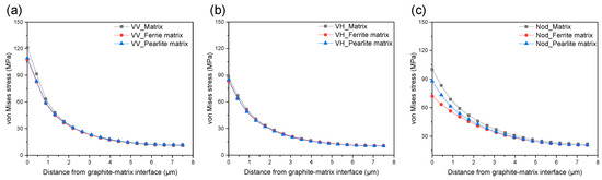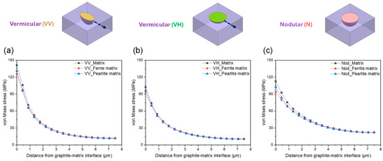 The distribution of von Mises stresses is measured and summarized in Figure 8 and Figure 9 for path AB (see Figure 2) from the graphite–matrix interface on the top surface of the metallic matrix to the edge of the model. As discussed, the major axis length of the vermicular graphite particle was equal to the diameter of the nodular inclusion (15 μm), while the length of the cubic model was 30 μm. Thus, the length of the path in the metallic matrix was 7.5 μm (the position with 0 μm corresponds to the interface). The domain was stress-free before the thermal loading.