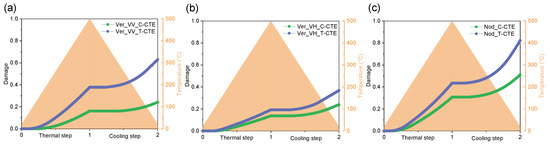 Evolution of maximum damage in graphite inclusions with different CTE of graphite in common matrix: (a) Ver_VV; (b) Ver_VH; (c) Nod.
