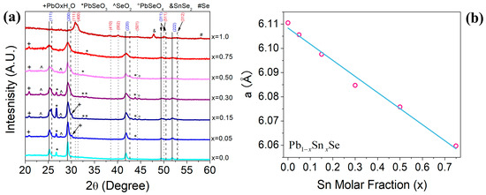 XRD patterns of the sprayed films (a) PbSe (x = 0.0), the x = 0.05–0.75 alloys, and SnSe (x = 1.0). (b) Lattice constant as a function of the nominal Sn molar fraction (x) obtained by analyzing the (311) and (222) peaks of each alloy, the solid line is the fit curve corresponding to Equation (1). Cross, star, circle, and caret marks indicate oxidized phases in the films, whereas ampersand and number sign marks indicate secondary phases in x = 1.0. Vertical continuous lines are used to identify the PbSe reference, ICDD 00-006-0354, dashed lines correspond to the cubic SnSe pattern, ICDD 01-089-4781, and dotted lines were attributed to orthorhombic SnSe, according to ICDD 00-048-1224 pattern.