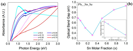 Absorption spectra as a function of the photon energy for the alloy films and their extremes (Pb1−xSnxSe) are shown in Figure 2a. For x = 0.0 (PbSe), it can be seen that the absorption edge is located at a value less than 0.70 eV. As the Sn content increased, the absorption edge slope changed and was shifted towards lower energies than 0.70 eV up to x = 0.30. Starting from x = 0.50, the slope changed significantly and the absorption edge was shifted again, but towards higher energies. These spectra made it possible to estimate approximately the optical band gap energy (Eg) by the Tauc method, considering the exponent value for direct transitions as 1/2, applied to the alloys 0 ≤ x ≤ 0.30, and the value of 2 for indirect transitions to x ≥ 0.50.