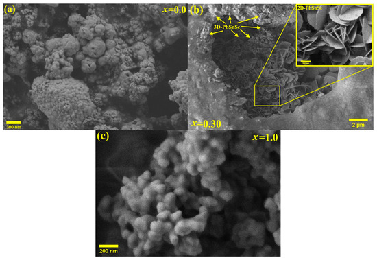 Surface view SEM images for representative Pb1−xSnxSe alloys are displayed in Figure 3. For PbSe (x = 0.0) a morphology composed of semispherical- and faceted-like agglomerated granular crystals and porous formed among agglomerated structures is shown in Figure 3a, varying in size from the reported value from XRD (16.42 nm) to various hundreds of nanometers. Large crystals were formed during the colloidal dispersion deposition by self-assembly, from a nanocrystal distribution centered at 16.42 nm as primary building blocks [26]. Similar morphologies were also exhibited for the Pb0.95Sn0.05Se and Pb0.85Sn0.15Se alloys, not presented here. In Figure 3b, for the Pb0.70Sn0.30Se alloy, a combined morphology where two different crystalline shapes coexist can be seen. The first one consisted of tin alloyed to lead selenide nanocrystals (3D-PbSnSe), which formed polyhedral- and granular-shaped structures, and the second one resulted in semicircular thin platelet-shaped 2D-PbSnSe crystals of several hundreds of nanometers in diameter.