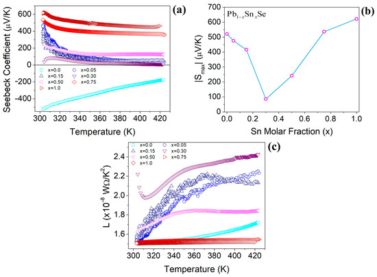 (a) Seebeck coefficient as a function of the temperature, (b) Seebeck coefficient maximal magnitude as a function of the nominal composition (x) between room temperature and 313 K, and (c) Lorenz number vs. the temperature for the sprayed Pb1−xSnxSe x = 0.0–1.0 alloy films. Positive Seebeck values indicate p-type conductivity and negative ones indicate n-type conductivity.