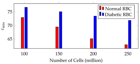 This Equation (7) can be utilized to calculate the mixture conductivity for normal and diabetic red blood cells as 0.63 and 0.68 S/m, respectively. Due to the significant variance in () and relatively minor change in () between normal and diabetic RBCs, conductivity is not used as a criterion for identifying diabetes in this study. Table 3 summarizes the parameter changes for both normal and diabetic RBCs [53].