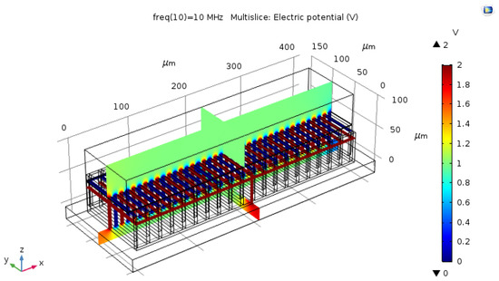 Our study highlights significant variations in bio-impedance data due to changes in the electrical properties of the PBS solution used for measurements involving 200 million cells. These electrical property variations stem from the difference between healthy and diabetic blood cells. The value across the frequency range of 1 MHz to 10 MHz plays a key role in this phenomenon. As suggested by previous research [52,53], we calculated and tabulated the values for two design configurations (one with mm and another with µm dimensions) in Table 7 and Table 8. Figure 4 and Figure 5 visually represent the surface-charge density of interdigitated electrodes (IDEs) interacting with the medium within a COMSOL® simulation environment. These figures utilize electrodes with mm dimensions. Similarly, Figure 6 depicts the surface charge density of IDEs interacting with the medium in COMSOL® but with µm-sized electrodes.