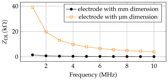 Variation of the double-layer impedance of IDE within 1 MHz–10 MHz using electrodes with mm dimension and µm dimension.