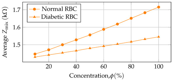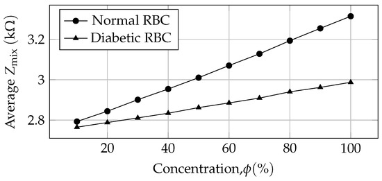 Here, 200 million cells are analyzed in 400 µL of phosphate-buffered saline (PBS) solution; the resulting values of are 0.133 and 0.062 for normal and diabetic blood, respectively. The Clausius–Mossotti factor is defined by Equation (3):