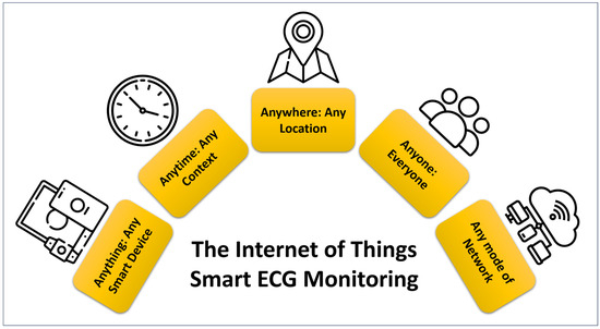 - Bushnag, A. A Wireless ECG Monitoring and Analysis System Using the IoT Cloud. Intell. Automat. Soft Comput. 2022, 33, 51–70. [Google Scholar] [CrossRef]