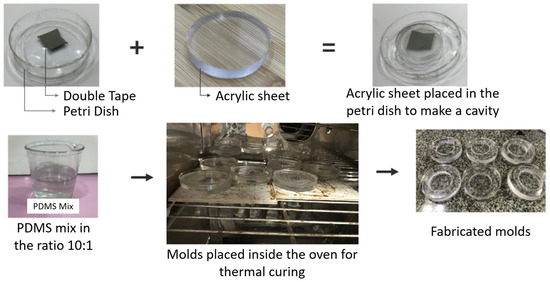 The electrodes were fabricated by pouring the carbon nanotubes/polydimethylsiloxane (CNT/PDMS) composite into the molds. The molds were cast using the Sylgard 184 Silicone Elastomer (Dow Corning, Midland, MI, USA) base 184A and curing agent Sylgard 184B [19]. The process of making the molds [20] was initiated by sticking a double tape inside the petri dish. Over the double tape, an acrylic sheet, with a diameter of 50 mm and thickness of 15 mm, was placed. Then, a mix of PDMS base and PDMS curing agent in the ratio of 10:1 was prepared. The PDMS composite was poured into petri dishes. The petri dishes were then placed in the oven for 30 min at 80 °C. After the composite was thermally cured, the molds were separated from the petri dishes immediately after taking out them from the oven after a 30 min curing period at 80 °C. The end products achieved were molds with a cavity (formed due to the acrylic sheet). The cavity was framed to hold the CNT/PDMS composite [21,22]. The process is shown in Figure 2.