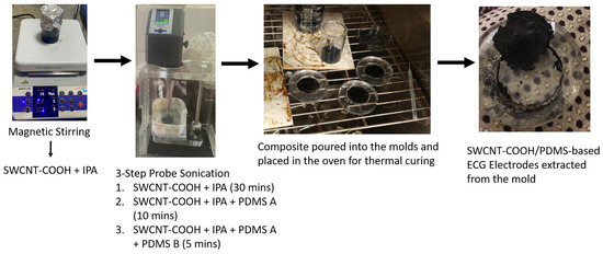 The electrodes were fabricated using SWCNT-COOHs, which were purchased from Nano Research Elements (Haryana, India) with specifications shown in Table 1. Functionalized SWCNTs were chosen for fabricating the electrodes because their dispersing capabilities were better than those of unfunctionalized CNTs. New functionalized groups upsurge the number of bands close to the Fermi level, stimulating electron transfer between the carbon atoms, which enhances the conductivity [23,24,25]. The polymer used with the filler was Sylgard 184 Silicone Elastomer purchased from Dow Corning with specifications shown in Table 1. It consists of PDMS A, the base, and PDMS B, the cross-linking agent. PDMS is used to bind the CNTs, give them their shape, and make the electrode flexible. Another important element for the fabrication is the solvent required for dispersing the composite. Isopropyl alcohol (IPA) was used for dispersing SWCNT-COOHs and PDMS as both of these materials are soluble in IPA; it was purchased from Loba Chemie with specifications shown in Table 1. IPA has large surface tension, with twice the vapor density of air, which helps in removing the air bubbles from the solvent. Solvents like methanol, which are non-polar, swell the PDMS matrix [26].