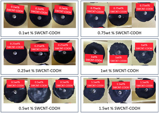 SWCNTs are capable of forming agglomerates due to strong Van der Waals force. Hence, to attain uniform dispersion of the SWCNT in PDMS, first, the filler is mixed and distributed using the magnetic stirrer with IPA (REMI 5 MLH). As a result, the SWCNT-COOH is distributed evenly. Different concentrations of SWCNT-COOHs (0.1 wt%, 0.25 wt%, 0.50 wt%, 0.75 wt%, 1 wt%, 1.5 wt%, 2 wt%, 2.5 wt%, 3 wt%, 3.5 wt%, 4 wt%, 4.5 wt%, and 5 wt%) were mixed with a proportionate amount of IPA. The stirring was performed at 300 RPM for 10 min. The process is portrayed in Figure 3.