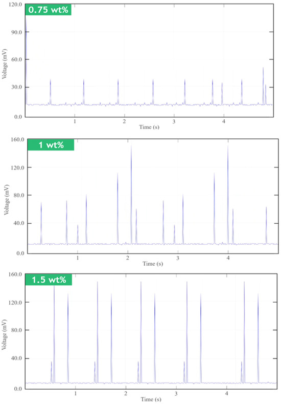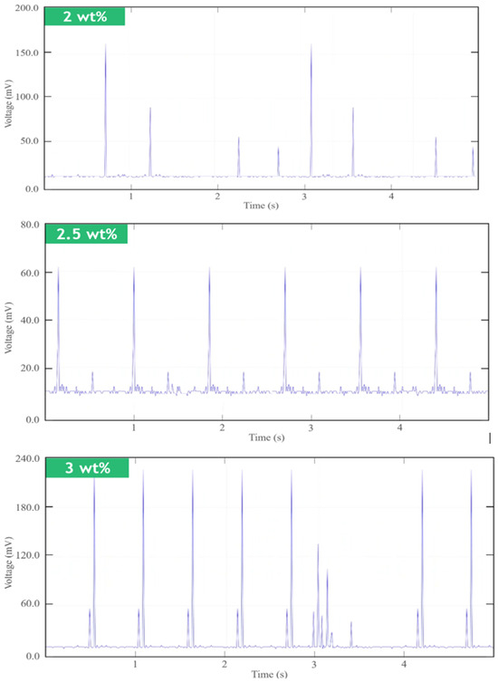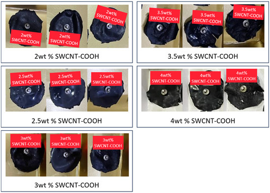 The percolation threshold was achieved at 4 wt% since proper electrodes could not be fabricated beyond this concentration. Also, the graph (Figure 9) shows the saturation point between 2.5 wt% and 3.5 wt%.