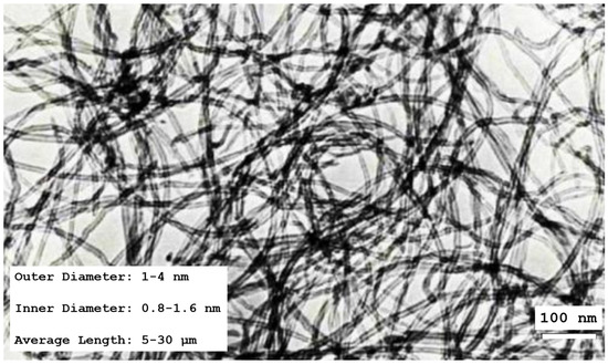 While SEM provides information on the surface details and composition, TEM includes information on the SWCNT-COOH internal structures. The TEM image is depicted in Figure 6. TEM confirmed the tubular structure of the functionalized SWCNTs. The inner diameter ranges from 1–4 nm and the outer diameter from 0.8–1.6 nm. A thin amorphous layer around the nanotubes demonstrated that the -COOH groups were successfully attached without damaging the structural foundation. SEM analysis specification can be seen in Table 2.