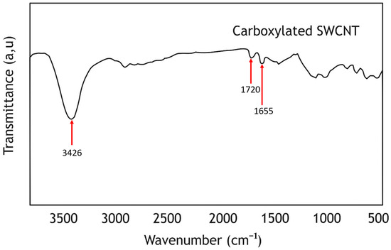 FTIR was conducted to identify the chemical bonds and characterize covalent bond information in this molecule by producing an infrared absorption spectrum. FTIR assessment exhibited peaks at 1720 cm−1 and 3000–3500 cm−1, representing C=O and O-H stretching vibrations, respectively, indicating the presence of carboxylic acid groups visible in Figure 7. Additional C-O stretching at ~1200 cm−1 demonstrated effective functionalization.