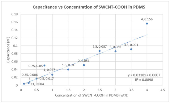 From Equation (2), it can be inferred that for every 1 wt% increase in the SWCNT-COOH concentration in PDMS, the capacitance increases approximately by 0.037 nF, but initially, it started with a small offset of about 0.001 nF.