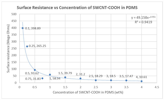 where x is the concentration of SWCNT-COOH (in PDMS) wt%; y is the surface resistance in MΩ.