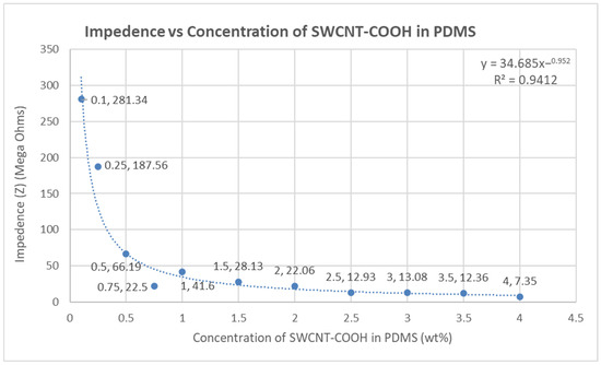 The impedance of the SWCNT-COOH/PDMS sensor was measured as a function of SWCNT-COOHs in PDMS (wt%). A power-law mathematical model (single-term) was used to evaluate a steep and rapid decline at low concentrations of the filler concentrations and a slow and gradual decrease at higher concentrations.