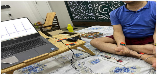The fabricated electrodes were worn by the volunteer for 5 days. The electrodes were attached to the participant’s left wrist, right wrist, and right ankle as shown in Figures 12 and 13. They were held on the electrode sites with the help of a compression bandage. The results were measured on the first day, third day, and fifth day. The results degraded on the third day and fifth day as compared to the first day. However, the results improved after cleaning the electrodes with methanol. Also, no kind of skin allergy or irritation was observed after the fifth day.