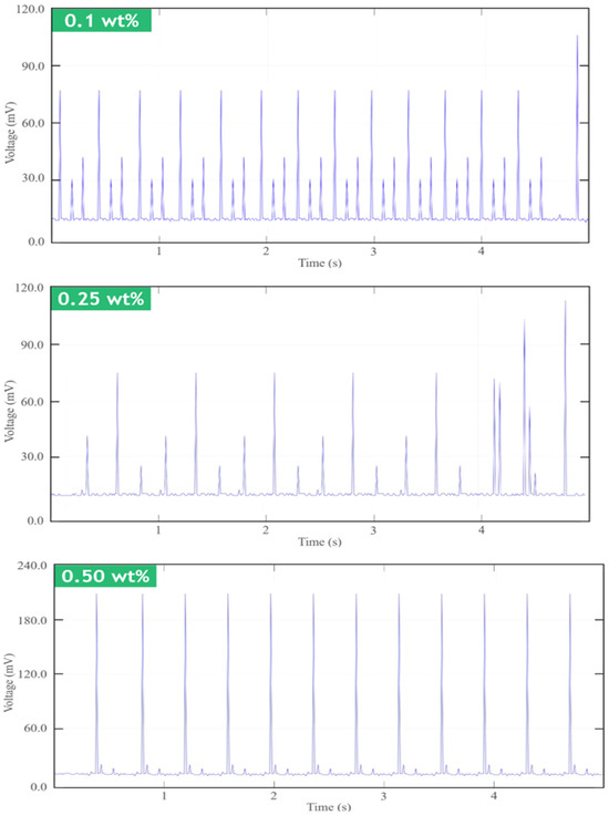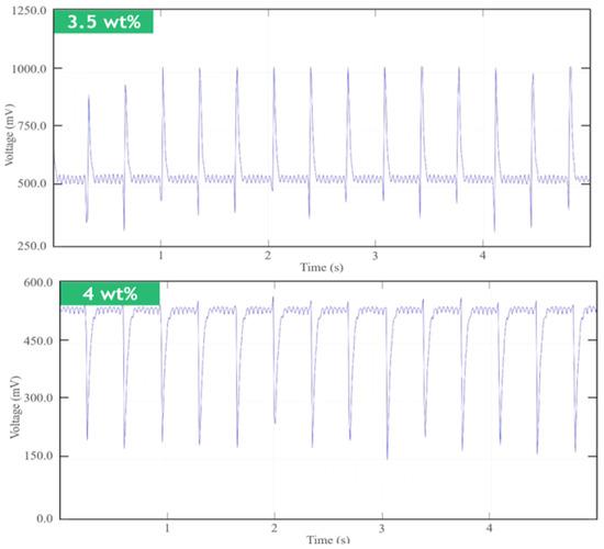As seen from the results, the initial peaks are also unclear and do not synchronize with the peaks of the ECG waveform (P, QRS, T). As the concentration of the SWCNT-COOHs increases in PDMS, the peaks become well-defined. The sharpest peaks are observed at 3.5 wt% and 4 wt%. The electrode with 3.5 wt% has the closest result to the Ag/AgCl electrodes.