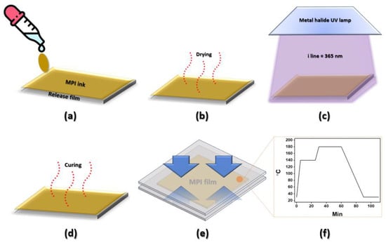 - Shoji, Y.; Hashimoto, K.; Koyama, Y.; Masuda, Y.; Araki, H.; Tomikawa, M. Low stress and low temperature curable photosensitive polyimide. J. Photopolym. Sci. Technol. 2021, 34, 195–199. [Google Scholar] [CrossRef]