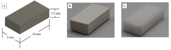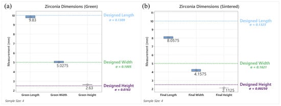In the secondary study, a 20% compensation was applied to account for expected shrinkage. The adjusted green state dimensions were 12.04 ± 0.11 mm × 6.02 ± 0.09 mm × 3.10 ± 0.07 mm (Figure 5). After sintering, the final measured dimensions were 9.69 ± 0.0328 mm × 4.83 ± 0.0025 mm × 2.47 ± 0.01 mm, showing a 3.21%, 3.3%, and 1.1% reductions in length, width, and height, respectively. The final density of the compensated zirconia part was 6.04 ± 0.04 g/cm3.