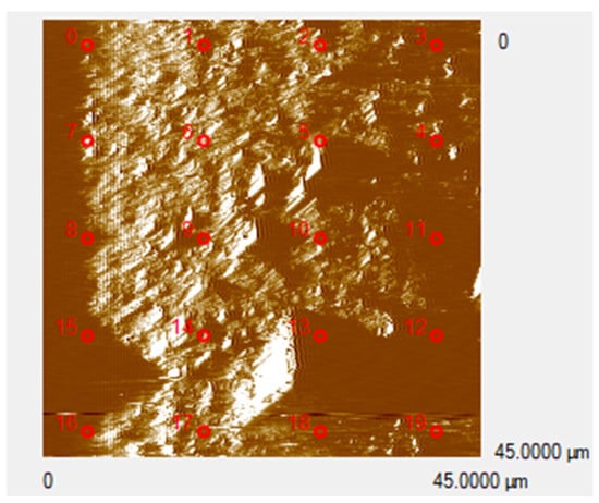 A total of 20 indents were made on each sample within a 45 × 45 µm² area, arranged in a grid pattern consisting of 4 indents in the x-direction, spaced 12 µm apart, and 5 indents in the y-direction, spaced 10 µm apart. This configuration, optically displayed in Figure 3, is standard practice [39] and ensured the uniform distribution of indents, minimizing potential interactions between adjacent indents and reducing the influence of surface defects on the measurements. Additionally, performing 20 indents per sample is consistent with established nanoindentation studies on ceramics and provides sufficient data density for statistical reliability.