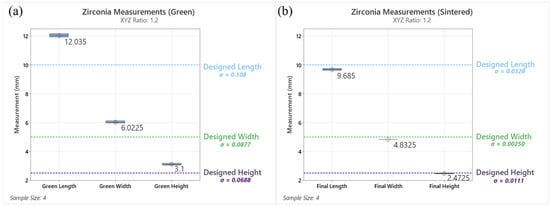 Figure 5. Green (a) and sintered (b) measurements and standard deviation of NIRPS with an XYZ compensation ratio of 1.2.