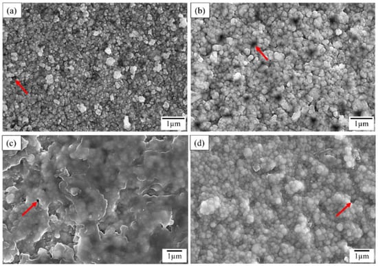 Figure 6 illustrates the surface microstructures of preconditioned and sintered ZrO₂ samples 3D-printed with two different print orientations. All samples were polished before the SEM analysis. The SEM images reveal a uniform distribution of ceramic particles across all samples in both preconditioned (green) and sintered states. However, some pores are visible in the preconditioned samples, as indicated by red arrows in Figure 6a,b.