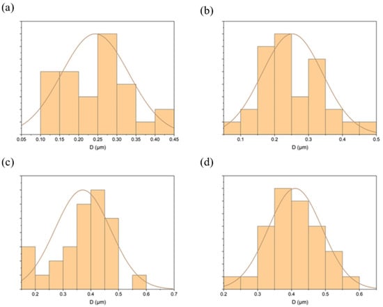 Figure 7. Particle size distribution histograms for varying orientations and processing conditions: P0 (a), P90 (b), S0 (c), and S90 (d).
