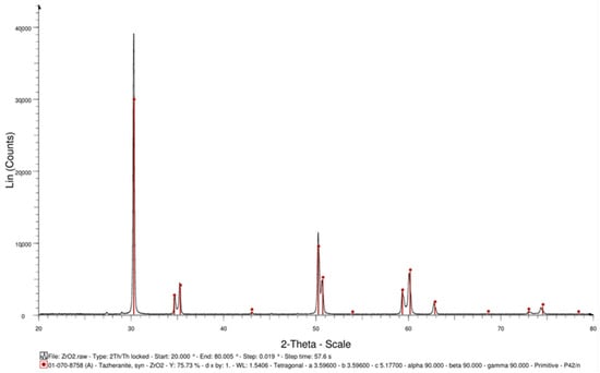 X-ray diffraction (XRD) analysis was conducted to verify the crystalline phase of the sintered zirconia samples, displayed in Figure 8. The diffraction pattern displayed in Figure 8 revealed peaks corresponding to the tetragonal structure of zirconia, with no evidence of monoclinic or cubic phases.