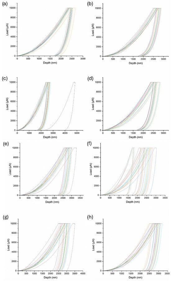Figure 10. Sintered NIRPs additively manufactured at 90° (ad) and 0° (eh). Different colored lines represent individual indents.