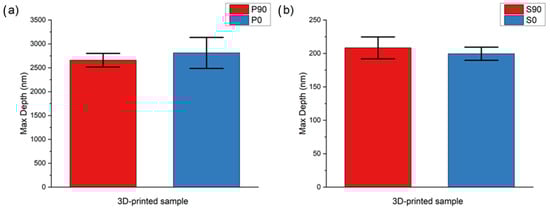 After sintering, indentation depths significantly decreased to around 150 nm at maximum load. This reduction is attributed to material densification and the removal of organic binders, leading to a more rigid and less porous structure. The difference in indentation depth between the preconditioned and sintered NIRPs suggests a tenfold improvement in mechanical resistance post-sintering. Figure 11 illustrates the influence of printing orientation on the indent depth, where the 0° samples exhibit shallower depths, likely due to a stronger interlayer bond.