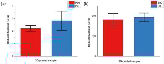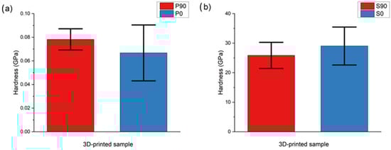 Orientation differences were also evident across all thermal stages: P90 had 14% higher hardness than P0 (0.078 GPa vs. 0.067 GPa), whereas P0 exhibited a 28% higher reduced modulus and elastic modulus. S0 exhibited superior mechanical properties across all metrics compared to S90, with a hardness value 12% higher, a reduced modulus 6.6% higher, and an elastic modulus 7.6% higher.