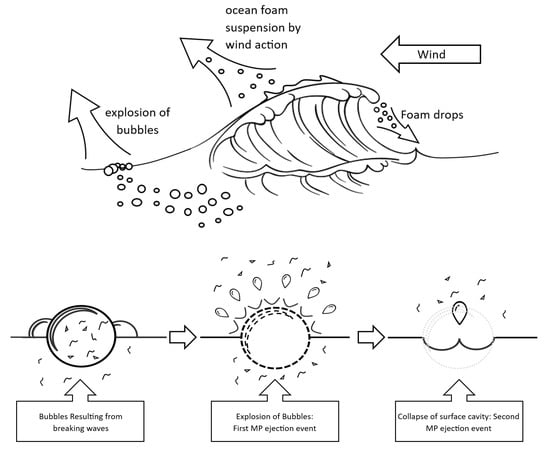 Breaking ocean waves produce bubbles at the surface; MPs are enriched at the sea surface and even more in these bubbles prior to bursting, due to a process known as bubble scavenging. The bursting of the bubbles produces aerosols that contain inorganic and organic materials. Most particles leaving the sea surface are salt and organic matter, of which 6700–7400 Tg particles (most measuring around 20 µm) are exported per year by aerosols produced by wave and wind activity through convective updrafts [92,93,94,95]. Micro- and nano-sized salt crystals are expelled from the sea when waves break and the resulting bubbles burst; the same scenario can be proposed for MPs (Figure 2), which may have been enriched from the bulk seawater by the bubble scavenging process, especially if they have retained their hydrophobic surfaces. The bursting of the surface bubbles provides nano-sized particles expelled into the adjacent air, able to be carried away by the winds [96,97]. The burst bubble leaves a cavity in the sea surface, which then collapses, generating a second release of particles. This process also exports organic matter that is an acknowledged element for the formation of clouds and rain (particularly in warm air) [97,98] and would lead to the incorporation of MPs into clouds, with subsequent transport through the atmosphere and release in rain (see the Section 2). The ejection capacity of these processes has been proven by tracking bacteria and virus cells as they travel in the wind and as aerosols across continents and oceans, a process similar to what happens with salt crystals and a blueprint for the release of MPs from marine aerosols [99,100,101,102,103,104,105]. Thus, the much-reported ocean “sink” for MPs can become a source of these particles, and evidence for this has been provided by Trainic et al. [104]. Noorimotlagh et al. [105] suggest that “bubble bursting” is one of the major sources of MPs in the external air. Sea spray has been stated to be the dominant source of MPs for long-range transport. Ryan et al. [106], using HYSPLIT modelling, determined that the increased MP levels in the air over Newfoundland after the passing of Hurricane Larry in 2021 likely came from the North Atlantic Gyre Garbage Patch, originating in sea spray [107]. Harb et al. [108] calculated that aerosolization increases with both ocean concentration and decreasing particle size, while Bucci et al. [109] used a Lagrangian model to determine that a major hotspot for such emissions is the tropics and that MPs released and penetrating into the stratosphere may persist for months. The same authors stated that current observations of MP concentrations above the oceans are underestimated by one to two orders of magnitude, though Yang et al., [110] in their review, found the range of published values to vary by four orders of magnitude, from 7.7 × 10–4 to 8.6 megatons per year. In spite of variations in degree, the oceans are certainly important sinks of MPs, contributing to their dispersal around the world.