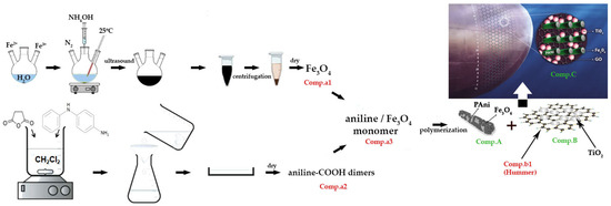 Τhe synthesis process of the proposed final antifouling coating, illustrated in Figure 1, comprised three phases: Comp.A, Comp.B, and Comp.C. The initial phase of the synthesis aimed to modify polyaniline (PAni) utilizing magnetite (Fe3O4) nanoparticles (NPs) and comprised a four-step process. The synthesis of Fe3O4 NPs through co-precipitation from divalent and trivalent iron salts was performed, utilizing ultrasound in the presence of ammonia (Comp.a1 in Figure 1). The functionalization of carboxylic acid dimer aniline (Comp.a2 in Figure 1) and its subsequent mixing in an acidic environment at ambient temperatures with the magnetite nanoparticles supplied in Comp.a1 was monitored. Subsequent to the mixing process, aniline cores externally decorated with magnetite were generated (Comp.a3). The initial phase involved the polymerization of the synthesized oligomers to produce polyaniline nanorods (PAni), which were externally decorated with magnetite nanoparticles (Comp.A). The second stage entailed the modification of graphene oxide (GO) sheets with titanium oxide (TiO2) nanoparticles adhering to the anatase crystal structure (Comp.B). Consequently, graphene oxide (GO) sheets synthesized via the modified Hummers method (Comp.b1) were combined in an acidic medium with titanium isopropoxide (Comp.b2). The final formulation of the suggested antifouling coating included a 1:2 ratio mixture of Comp.A and Comp.B in a water-soluble resin, along with the incorporation of additives (Comp.C).
