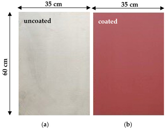 The microstructural characterization of the antifouling coating was followed by the application of paints to samples of naval steel (AH36) (Figure 2a) to evaluate their corrosion resistance. Rectangular samples of naval steel were cut using a cutting machine (Discotome 50, Struers, Inc., Willich, Germany) with water cooling. Then the samples were cleaned with deionized water and ethanol. The specimens, after drying at room temperature, were manually covered with two layers of the antifouling paint without an initial primer application (Figure 2b).