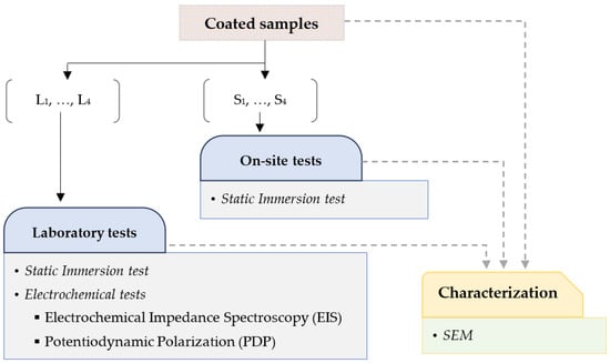 Two sets of coated steel panels were prepared: one set for corrosion assessments in controlled laboratory conditions and another set for evaluating corrosion resistance in situ under actual seawater conditions (Figure 3).