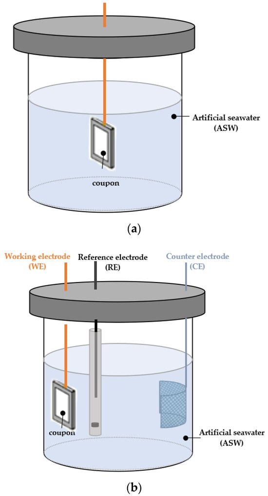 Four coated coupons, each measuring 4 cmL × 4 cmW × 0.5 cmT, were cut for corrosion evaluations in the laboratory. Three of the coated samples underwent static immersion testing in artificial seawater (ASW) [26] (Figure 4a), while the remaining samples were subsequently evaluated using electrochemical methods (Figure 4b). All measurements were conducted at room temperature.