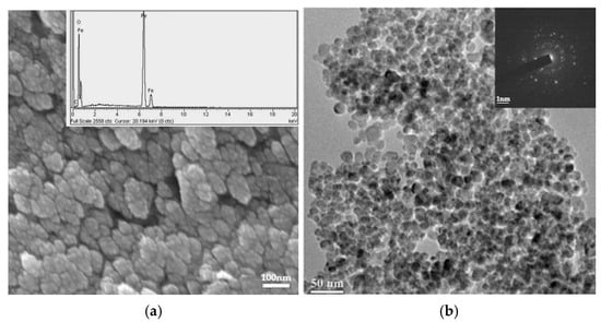 (a) Magnetite nanoparticles observed in a secondary electron picture using SEM. The inset image displays the generalized chemical microanalysis spectrum of the magnetite nanoparticles as determined by EDS. (b) Magnetite nanoparticles observed in a bright-field ΤΕΜ image. The inset image illustrates the SAED detection of magnetite.
